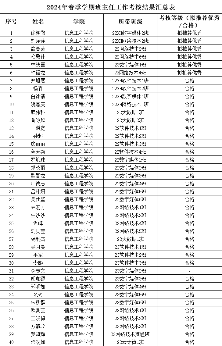 为全面贯彻党的教育方针,落实党和国家对德育工作的新要求,引导我院班主任牢固树立以德促教、以身立教意识,树立班级良好班风,增强班级学生骨干队伍建设。根据学校对班主任工作管理办法,对一学期以来班主任的各方面工作进行考核,现将考核结果公布如下。