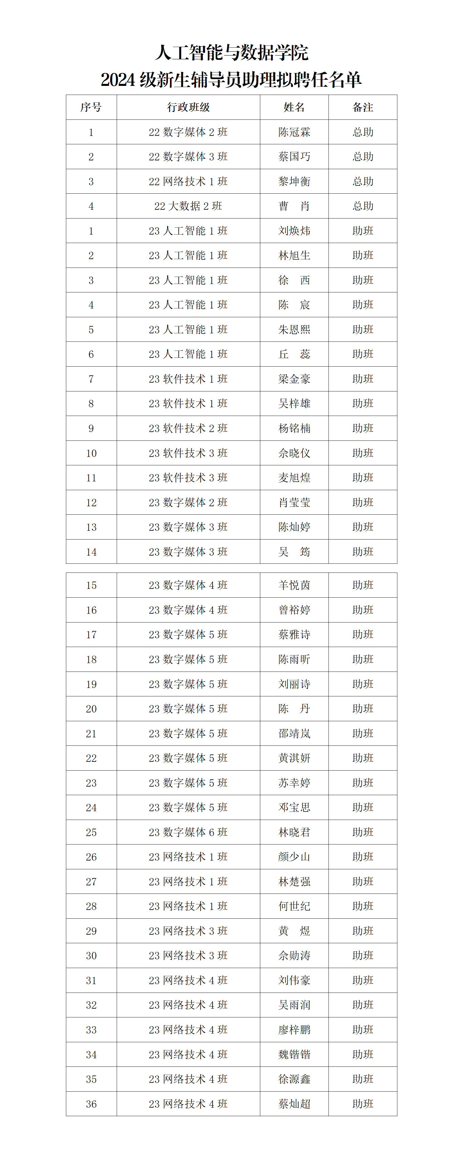 根据广州华商职业学院人工智能与数据学院评定条件,现拟定人工智能与数据学院2024级新生辅导员助理名单并予以公示(详情见附件《人工智能与数据学院2024级新生辅导员助理拟聘任名单》)。公示时间为2024年8月26日至2024年8月28日,共3天。凡对上述同学有异议者,请将书面反映材料扫描成PDF版并发送至邮箱hzxxgcxy@163.com