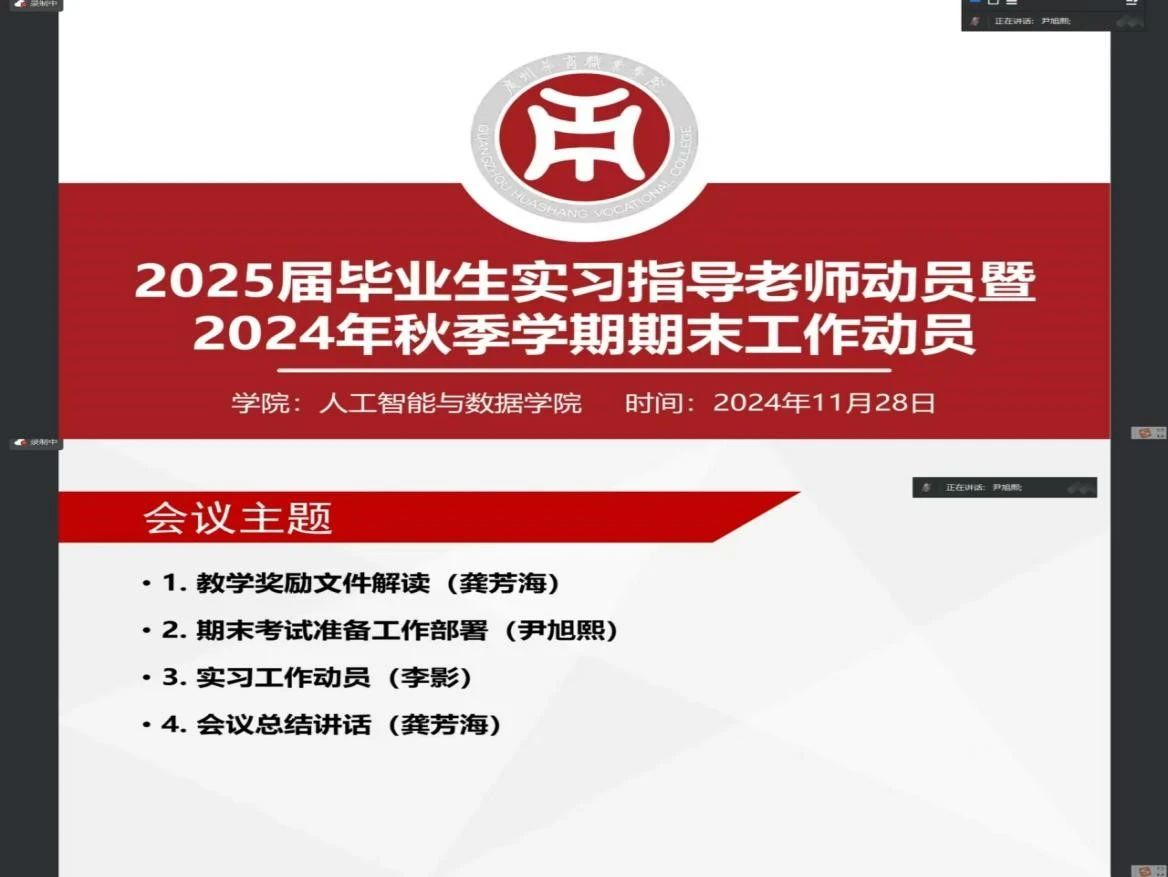 2024年11月28日,人工智能与数据学院成功召开了2025届毕业生实习指导老师动员暨2024年秋季学期期末工作动员会议,围绕教学奖励文件解读、期末考试准备工作部署、实习工作动员三个主题进行。会议由学院副院长尹旭熙主持,以腾讯会议线上形式召开,学院全体教师参加。
