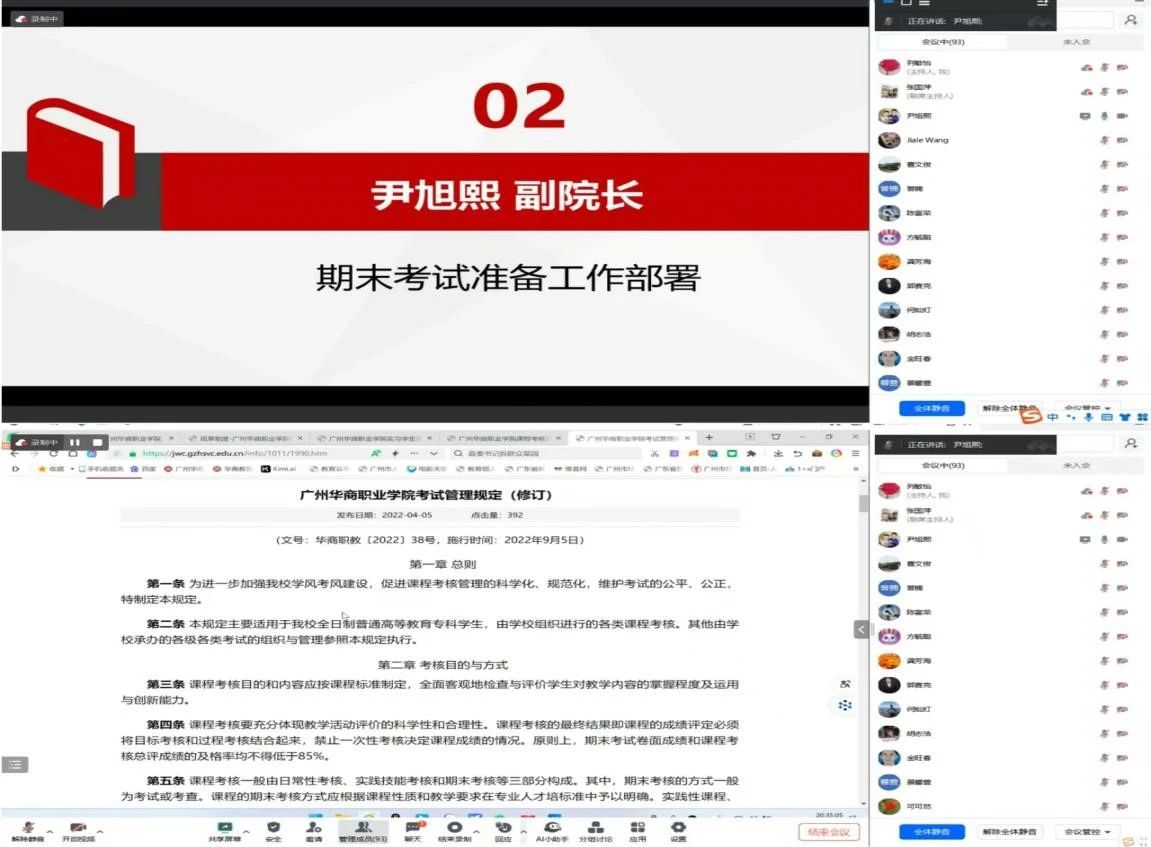 然后,尹旭熙副院长对《广州华商职业学院2024年秋季学期期末考试工作方案》以及《广州华商职业学院考试管理规定(修订)》进行了详细解读,重点强调了期末考试的试卷审核流程、试卷批改注意事项等相关工作。