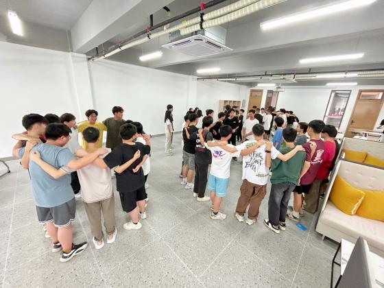在辅导员老师的指引下,同学们肩并肩围成圈站立,根据指令为前面的同学捏肩、捶背,边做边迈着欢快的步伐。这个环节不仅让同学们拉近了彼此的距离,更让同学们在身体上得到了放松,在心灵上感受到了温暖与关怀。