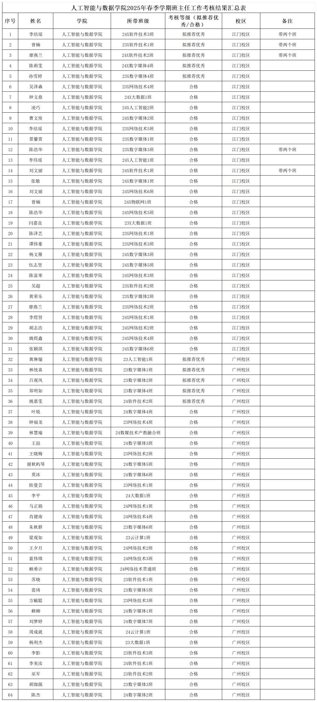 为全面贯彻党的教育方针,落实党和国家对德育工作的新要求,引导我院班主任牢固树立以德促教、以身立教意识,树立班级良好班风,增强班级学生骨干队伍建设的力度。根据学校对班主任工作管理办法,对一学期以来班主任的各方面工作进行考核,现将考核结果公布如下。 公示时间为2025年6月25日—2025年6月27日,共3天。公示期内对评选结果有异议者请以书面形式向人工智能与数据学院反映。 联系人:吴欣瑶 办公室:博A409 联系电话:020-82668091 广州华商职业学院人工智能与数据学院 2025年6月25日