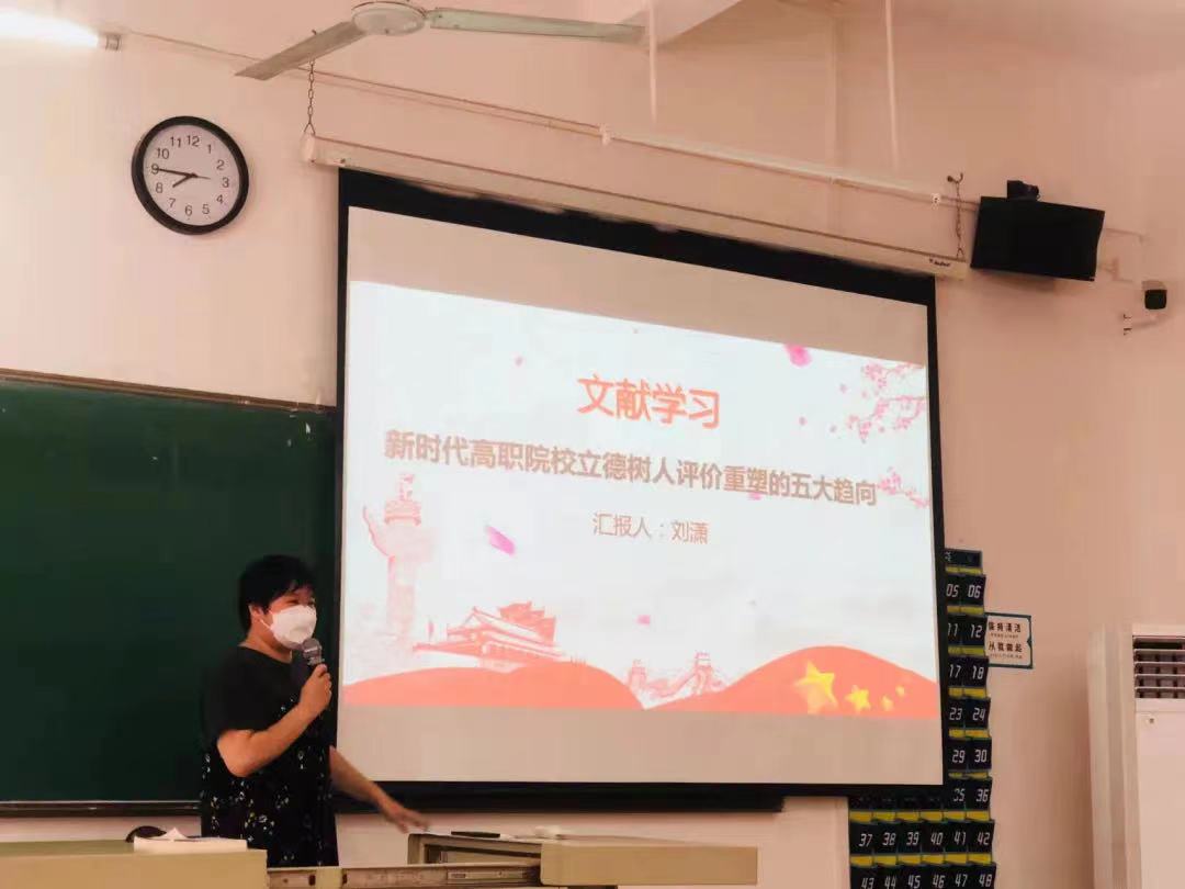 刘潇老师带领大家学习了《新时代高职院校立德树人评价重塑的五大趋向》。从评价理念、评价目标、评价标准、评价方式、评价结果应用五个方面介绍了立德树人评价重塑我五大趋势。