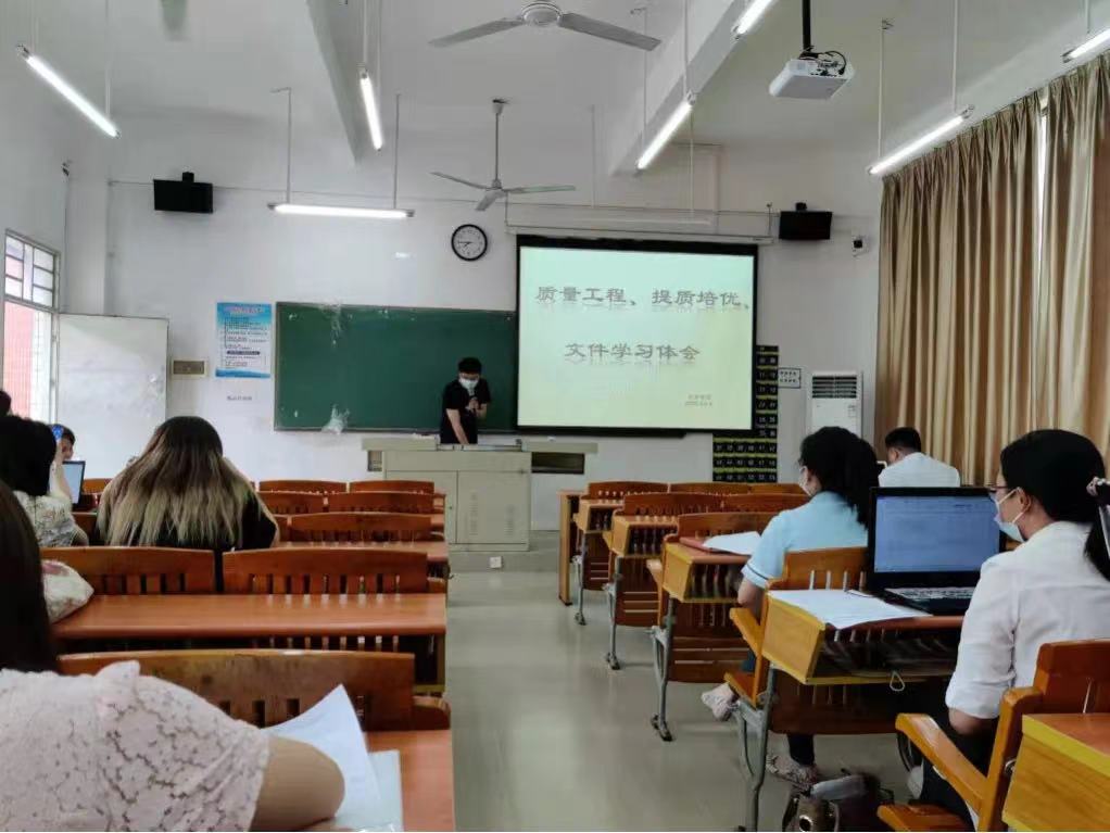 熊阳春老师详细解读了广东省教育厅、广东省财政厅关于印发《广东省高等学校教学质量与教学改革工程项目管理暂行办法》和《职业教育提质培优行动计划(2020-2023年)》。熊老师通过一系列数据介绍了职业教育的现状,并提出来一系列的专业介绍、课程改革、现代学徒制人才培养、校企融合等目标,最后提出了自己的学习心得:“真理掌握在少数人身上,但真理的执行需要多数人一起执行”,工作过程中有目标,希望大家一起努力共同提升华商的教育质量目标。