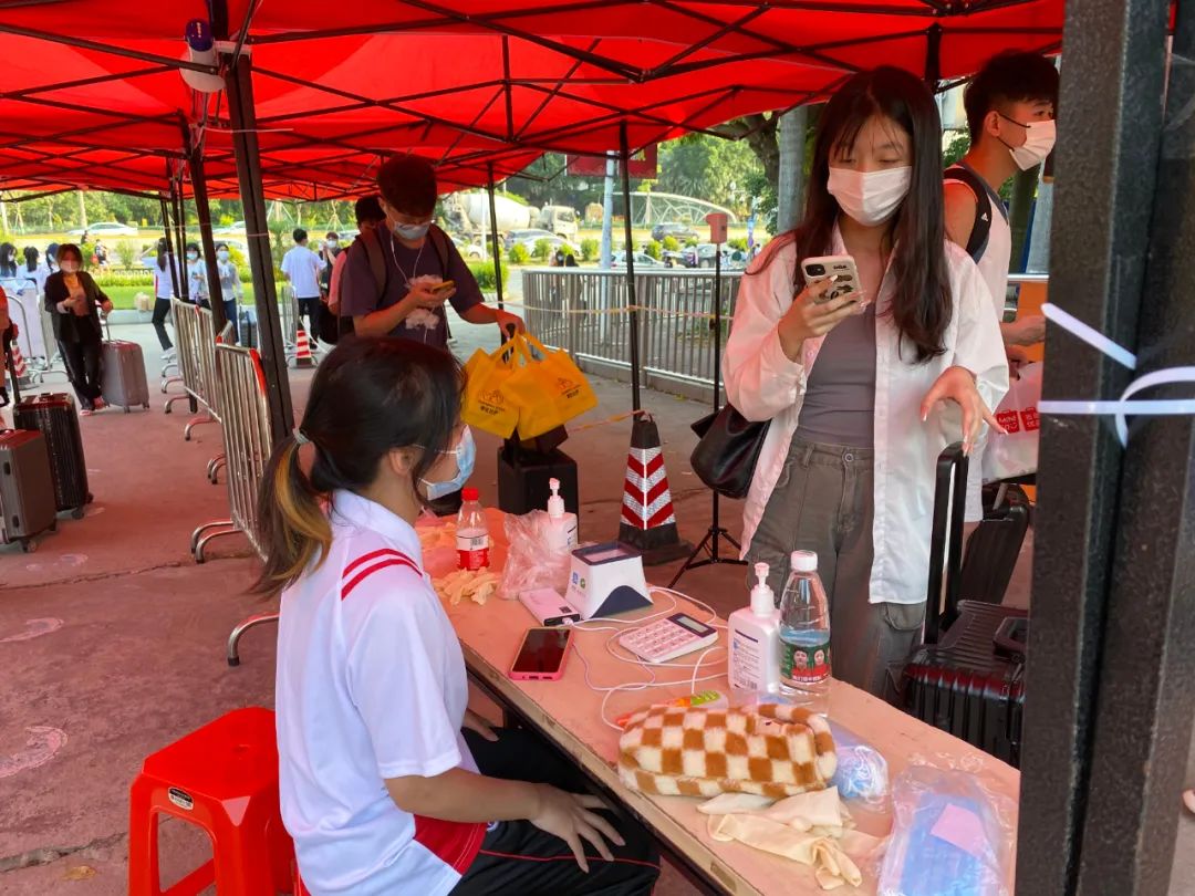 各位同学配合志愿者出示行程卡、穗康码、核酸检测证明,并且扫完华商e家健康码后方可进校。各学院学生进校后经老师的通知,前往报到处完成返校登记并按照规定路线前往核酸检测点,进行核酸检测。