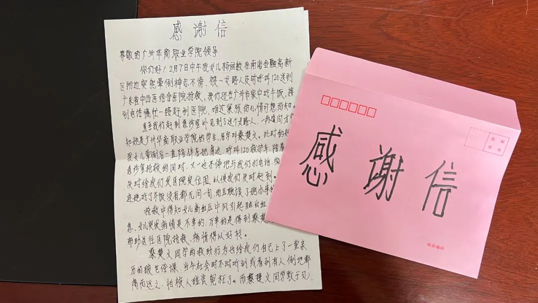 本学期开学不久,我校接到了一通特殊的电话:“请问你们学校有一位叫蔡楚文的学生吗?”经沟通了解到,学校健康医学院2020级药品经营与管理专业的蔡楚文同学,曾在寒假期间见义勇为,热心救助了在路边突发疾病的杨女士。时隔一个月后,杨女士的父亲(以下简称杨老先生)找到学校,送上一面锦旗及一封表扬信,希望能够当面表达他们对于蔡楚文同学热心善举的感谢。