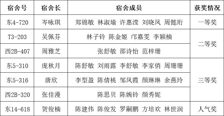 本次大赛组织不仅给个人提供了一个展现自我的平台,同时更好培养同学的集体荣誉感。此次宿舍文明评比大赛在掌声中落下帷幕。