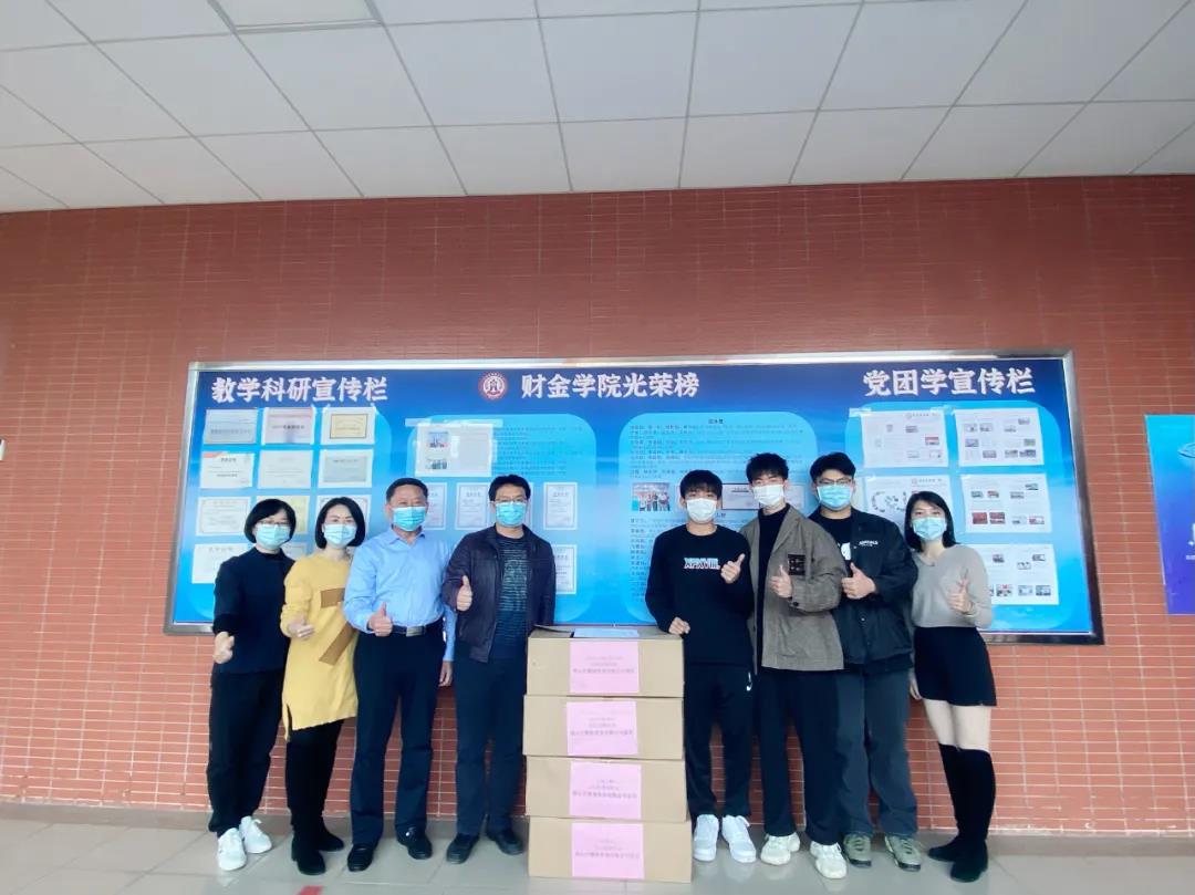 最后,财金学院疫情防控小组接受捐赠物资并合影留念。