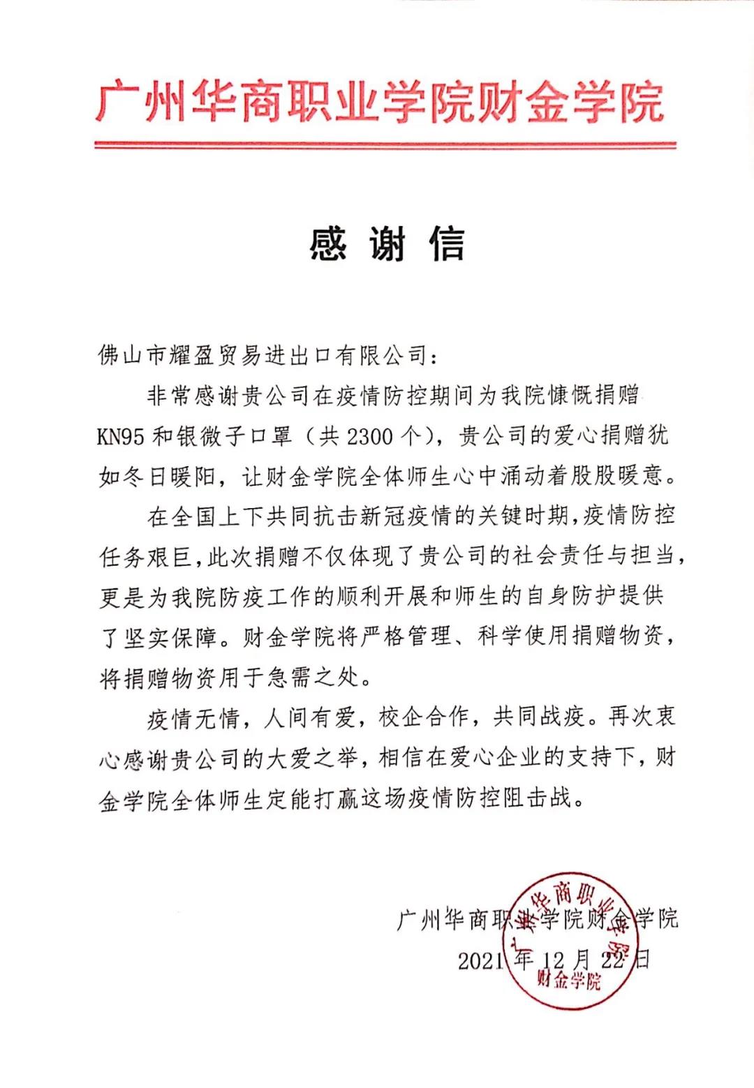 12月22日下午,2021级学生杨衡辉、安镇东、朱旻阳代表佛山市耀盈贸易进出口有限公司向我院捐赠2300个KN95和银微子口罩,财金学院李哲院长、党总支金新凯副书记、陈少兰副院长、殷建玲副院长和郑傲然辅导员共同参与了此次物资捐赠仪式。