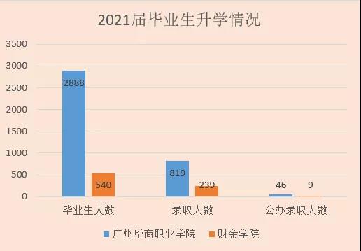 2021年广州华商职业学院专升本总升学率(录取人数/毕业生人数)为28.36%;录取率(录取人数/报考人数)高达80.85%,即相当于在100位考生里就有80位学生被本科院校录取。财金学院2021年升学率更是高达44.26%,创历史新高,高居学校第一,大幅高出全省平均水平。