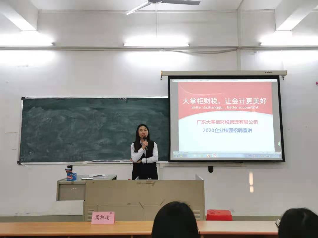 最后,是广东大掌柜财税管理有限公司的宣讲人周凯瑜经理。她通过ppt的形式向同学们详细介绍了该公司的发展历程、组织架构、公司前景及用人制度等。同时,希望同学们能够找到自我实现的价值和目标,并为之努力奋斗。