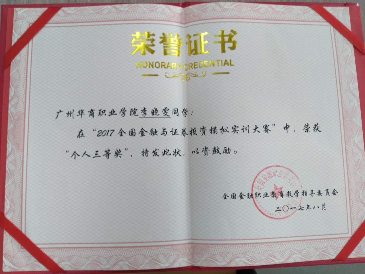 由全国金融职业教育教学委员会主办、深圳国泰安教育技术有限责任公司承办的“2017全国金融与证券投资模拟实训大赛”初赛赛程已经结束,此次竞赛共有来自全国220所院校,846支队伍参与,参赛人员达到了8460人。经过近2个月的激烈角逐,由侯娟老师指导的刘嘉豪、李晓雯两名同学,以全国排名第199位、第740位的成绩分别荣获得个人二等奖和个人三等奖,侯娟老师荣获优秀指导老师称号,为学院争得了荣誉。
