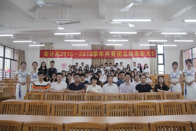 我系于2016年5月10日下午在博学楼C401隆重召开“会计系团总支2015-2016学年“五四”总结表彰大会”。出席本次会议的嘉宾有会计系田千喜主任、系殷建玲副主任、院团委吴伟福书记、系团总支书记姚柏洲老师以及全体辅导员老师,全部获评的同学也参加了本次大会。