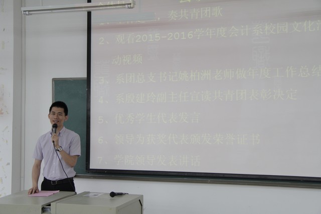 大会在庄严的共青团团歌中拉开序幕。随后观看团学组织风采视频,回顾过去团学活动工作中的精彩和喜悦。之后,系团总支书记姚柏洲老师做会计系团总支年度工作总结:会计系学生组织工作健全,逐步完善工作职能,重视学生干部主体性,落实学生队伍思想素质建设;创会计特色,建优良学风,会计系大力开展校园文化活动建设,以活动促学风。姚老师表示,会计系团总支将一如既往,认真踏实地完成工作,为学院作贡献。接着,由系田千喜主任宣读共青团表彰决定,宣布系团总支此次五四评优中获奖的个人及集体。其后由优秀学生代表刘炫志、钟庆龄同学发言。尔后,嘉宾,领导为获奖人员进行颁奖。最后由学院团委吴伟福书记作重要讲话,吴书记对会计系团学工作表示高度的认可,并希望会计系团学工作能够一如既往,更上一层楼。