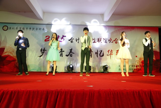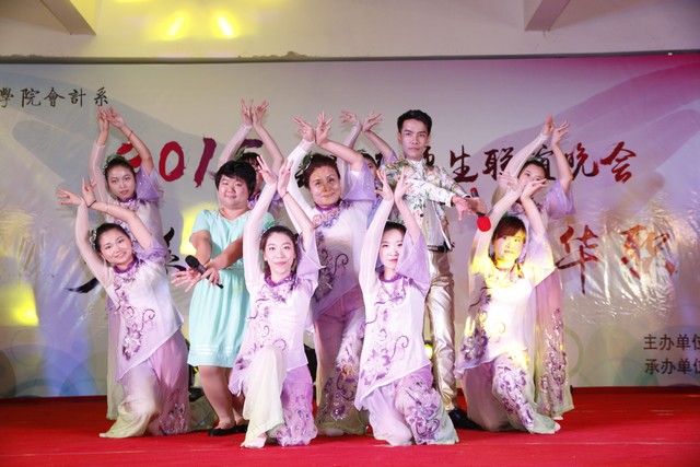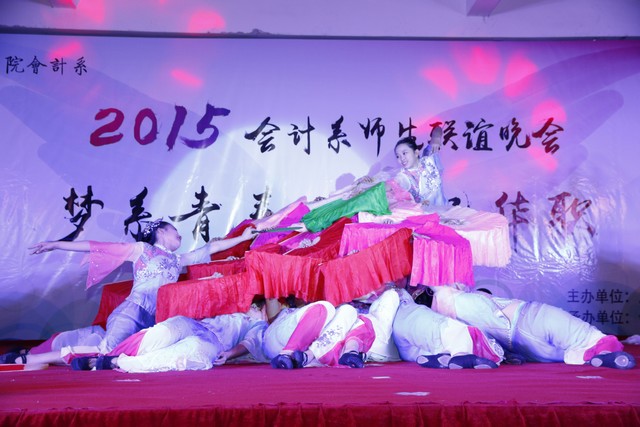 晚会开场由Revival乐队带来的歌曲串烧《21 Guns》、《星空》,精彩表演挑起了全场师生的激情,赢得了观众的一片欢呼。随后,学院党委黄桂标书记上台致辞,对我系本次联谊会表示肯定,同时对我系所取得的成绩感到骄傲,并对师生今后的工作和学习提出了新的要求与希望并预祝联谊会成功举办。之后,联谊会节目精彩上演。舞蹈《舞动心弦》洋溢着同学们的青春活力,赢得阵阵掌声;小品《寝室一家人》将宿舍生活的喜怒哀乐表现得淋漓尽致,饱含感情的朗诵搭配着民乐演奏《桅子花开》,勾起了关于匆匆三年校园生活的点滴回忆,而后展示的校园文化的视频《纪念日》更是扣人心弦,紧接歌手队的深情演唱《嘿,同学》完美的诠释了对即将离校的学子那份眷恋与不舍。接着,《魅力男班》闪亮登场,活泼可爱的舞蹈搭配着风格各异的歌曲,使整个晚会现场欢声笑语。穿插在联谊会间隙,精心准备的游戏环节和抽奖环节,一次次把联谊会的气氛推向高潮。王莉丽主任带领会计系老师倾情出演歌舞《荷塘月色》,博得台下观众阵阵喝彩。民舞《梦里寻他千百度》伴随动听的音符向观众展示了优美的舞姿,寓意主动、向上的民族精神,同时让全场师生领略了东方的神韵。最后,联谊会在《我的未来不是梦》和《讲不出再见》的大合唱中画上圆满的句号。