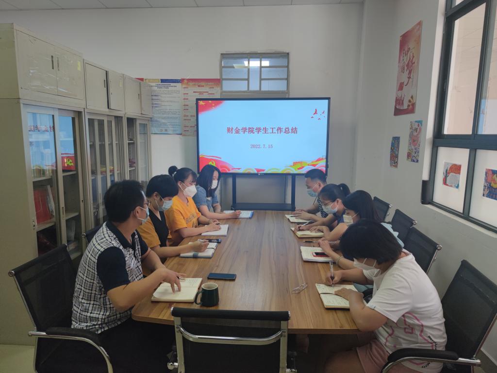 星光不问赶路人,时光不负有心人。一个学期又结束了,每日一点变化,每日一点进步,本学期各项工作也将顺利画上圆满的句号。为进一步提升学工队伍建设和履职能力,全面推进财金学院学生工作再上新台阶,2022年7月15日上午10:30,财金学院在博学楼A509会议室召开2022年春季学期学工团队总结述职会议,会议由党总支金新凯副书记主持,全体辅导员参加会议。