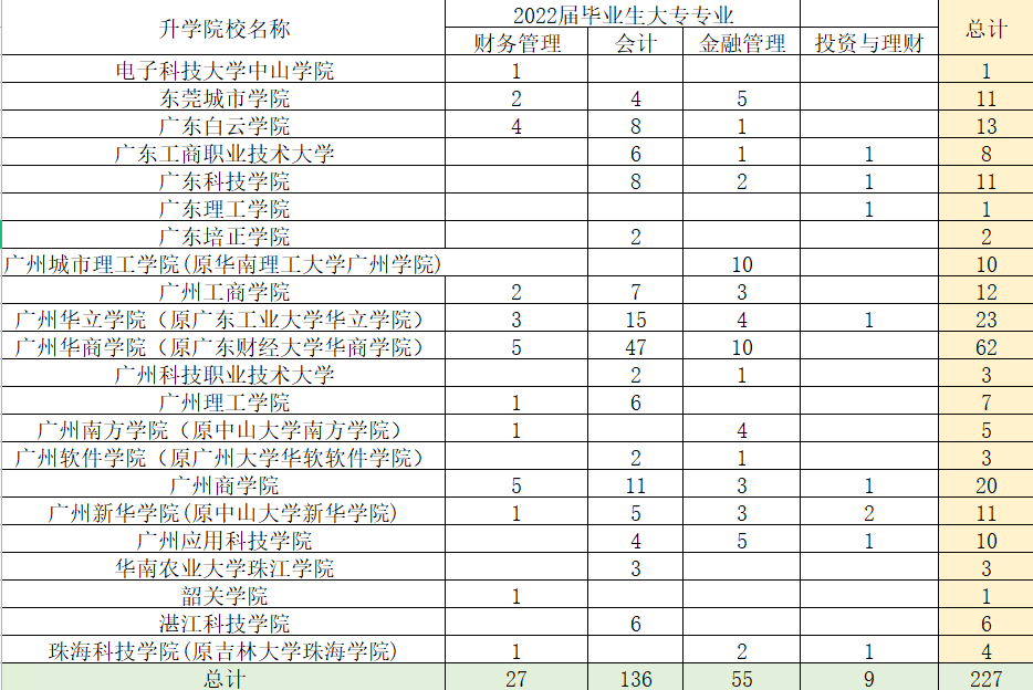 2022年广东省普通专升本考试(即专插本)招生录取工作已圆满结束,财金学院2022届毕业生捷报平传,喜获佳绩,共有227名毕业生被本科院校成功录取,其中包括韶关学院、珠海科技学院、广东白云学院等省内知名院校,成功被广州华商学院录取人数共62名。毕业生升学人数占比总人数达34.71%。