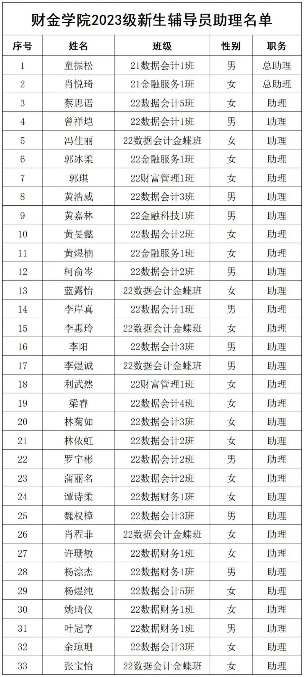 经面试培训及工作考察情况,拟录用童振松等33名同学为财金学院2023级新生辅导员助理,现予以公示。