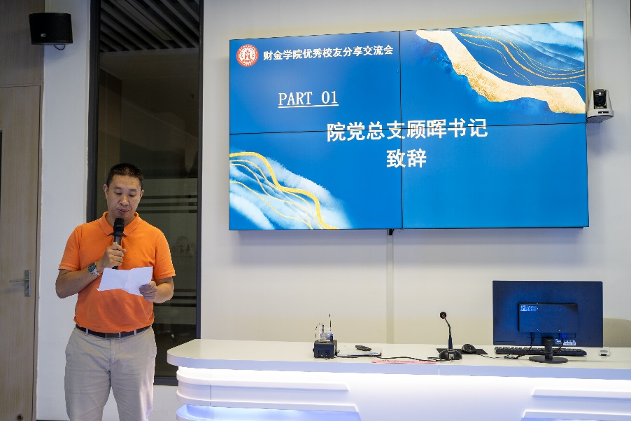 活动伊始由顾晖书记致辞,顾书记首先对到会的优秀校友代表表示热烈欢迎,同时感谢校友百忙之中抽出时间回校和在校学生分享毕业后的职场经验。