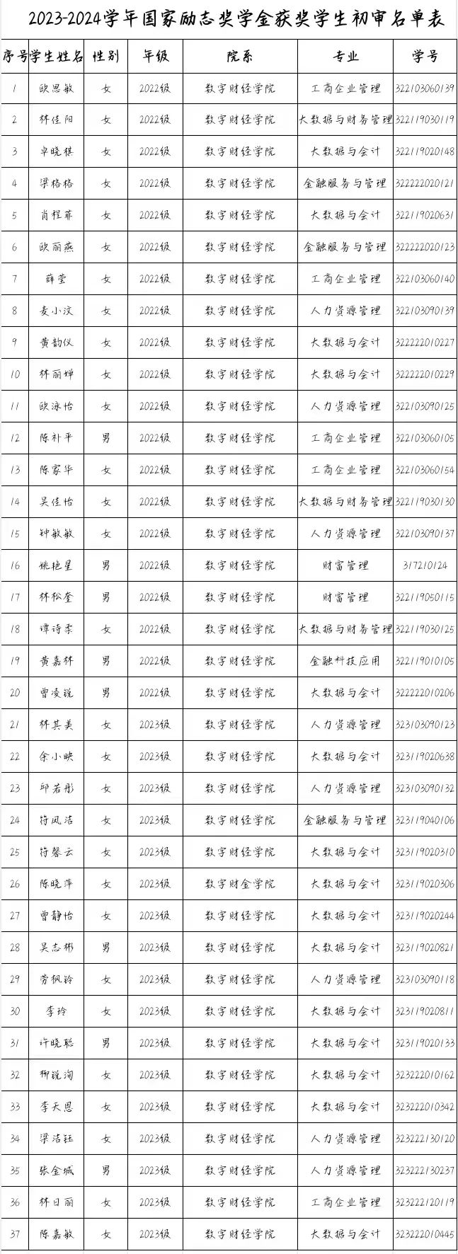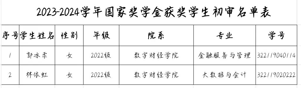 按照广东省教育厅相关文件精神,根据我校相关文件要求,结合我院实际情况,依据学生各方面表现,经学生个人申请、辅导员初审及学院审核,现拟推荐以下同学至学校参加国家奖学金、国家励志奖学金评选。