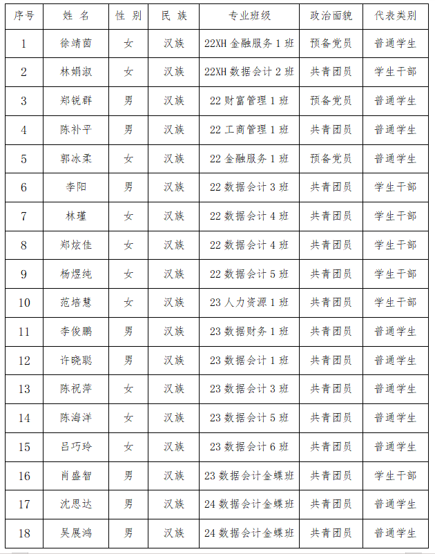 数字财经学院根据相关文件精神,拟推荐学生正式代表18名。学生代表产生由各班根据名额分配级构成要求,组织学生报名,采取差额选举的方式,在充分讨论的基础上确定代表候选名单,经资格审查小组审查和公示后,确保以下学生代表具备参会资格。