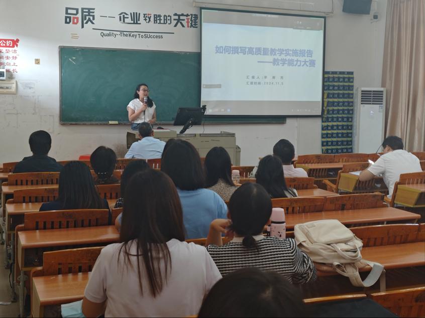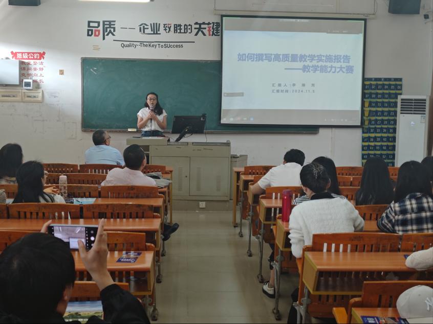 随后,培训会议进入核心环节,由经验丰富的优秀教师李琳芳教师分享了她在历届教学比赛中取得的宝贵经验和心得,并且从3个方面详细讲解了如何撰写教学实施报告,包括:1.研读文件,观摩作品;2.四项统一,编撰报告;3.深挖课程,突出特色;并强调了概括了教学实施报告是16课时的总结性文件,在教学过程中注重学生主体性和创新性的重要性,李老师从教学理论的高度出发,深入浅出地讲解了如何构建高效、有趣、富有启发性的课堂氛围,以及如何在教学中融入最新的教育理念和技术手段,并提供了相应的教学资源,会议内容既有理论深度,又极具实践指导意义,让教师们受益匪浅,这次会议也加深了教师们之间的交流,也激发了他们对于教学比赛的热情和思考。