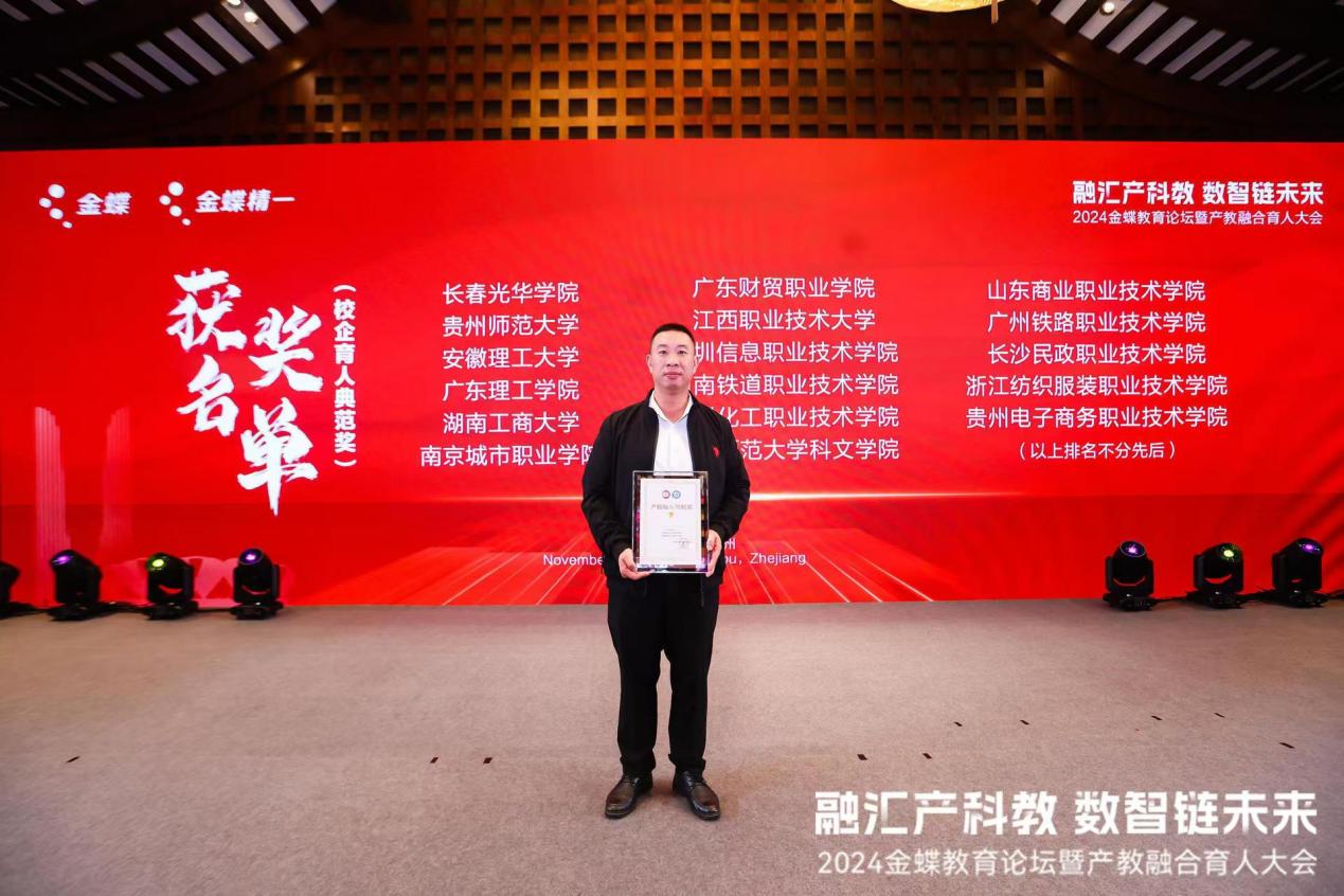 2024年11月10日,在刚刚落幕的“融汇产科教 数智链未来——2024金蝶教育论坛暨产教融合育人大会”上,数字财经学院以其在产教融合领域的卓越成就和创新实践,荣获了备受瞩目的“产教融合创新奖”。这一荣誉不仅是对学院在教育创新和人才培养方面所做努力的认可,也是对其在推动产教深度融合、培养高素质技术技能人才方面所取得成就的肯定。