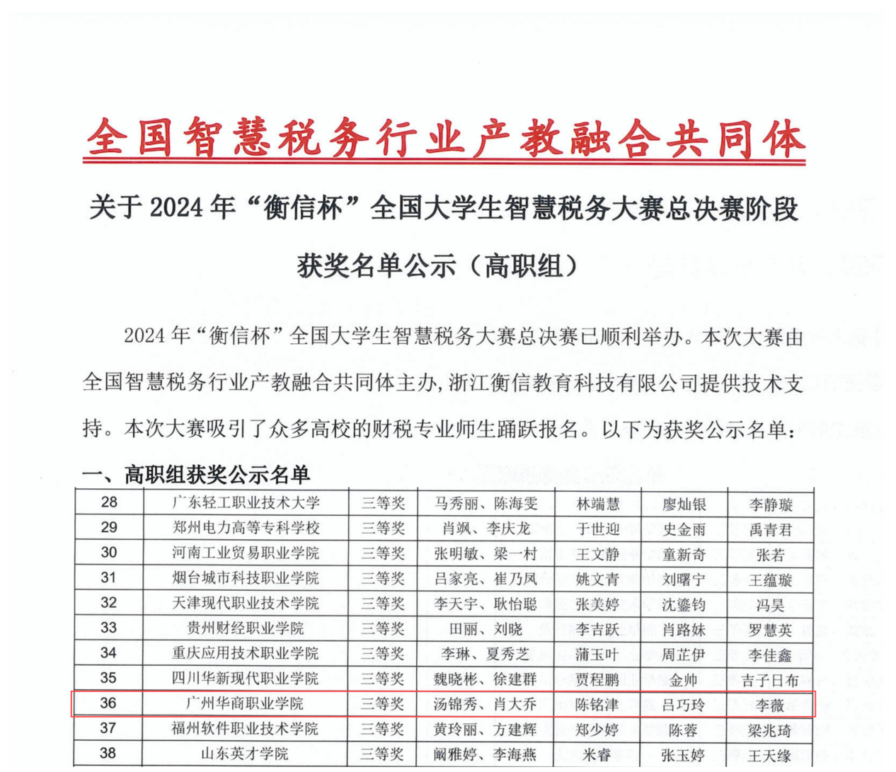 经过系统自动评分、实时滚动公布排行榜,我院学生陈铭津、吕巧玲、李薇及指导老师汤锦秀、肖大乔在备赛期间全身心投入备赛,终获2024年“衡信杯”全国大学生智慧税务大赛(第十届)总决赛三等奖。