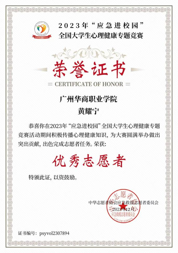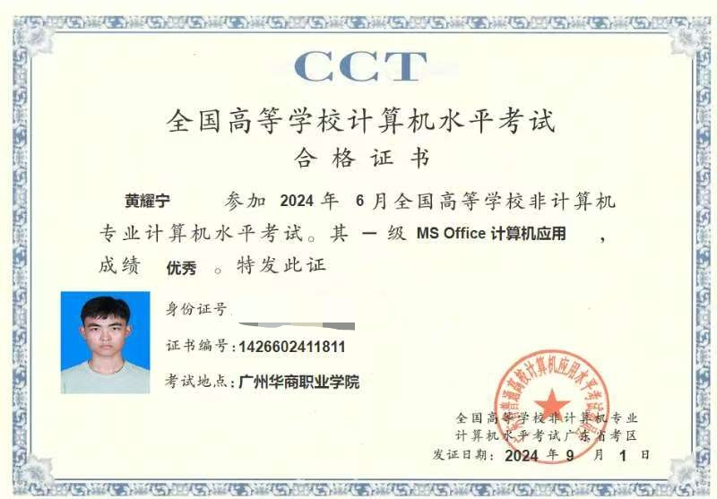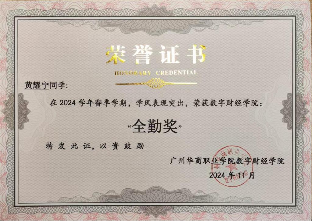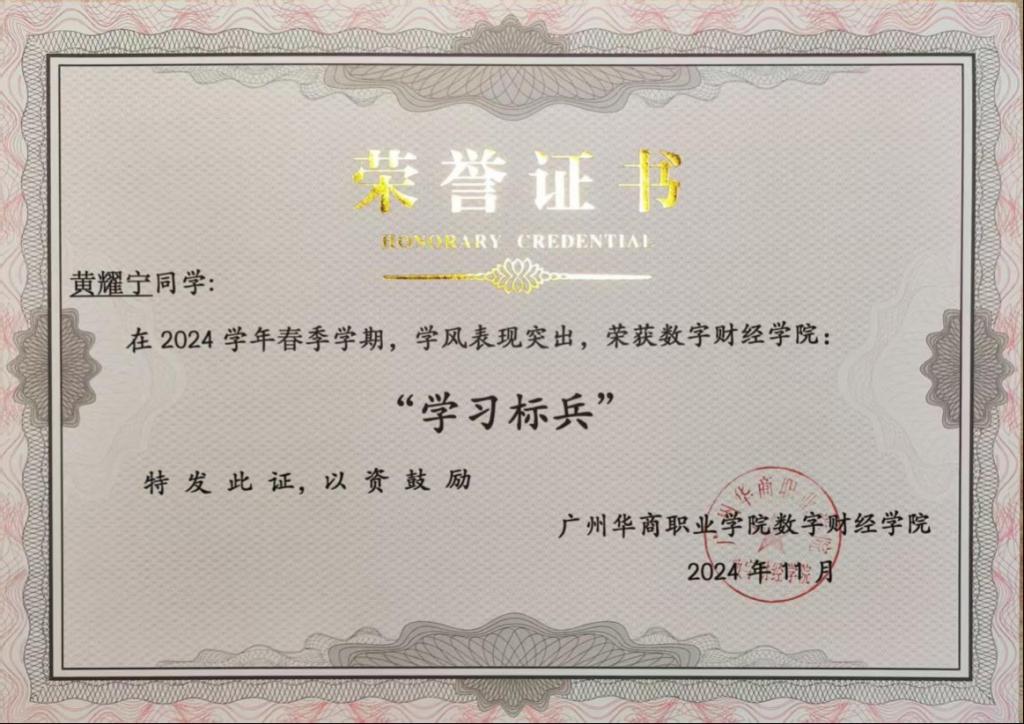 除初级会计高分,黄耀宁还斩获多项荣誉:2024 全国大学生企业数字化管理创新大赛区域赛二等奖、会计电算化优异成绩、CCT 计算机一级优秀证书、英语 B 级,以及 “应急进校园” 心理健康竞赛一等奖与 “优秀志愿者” 称号,多次获校级 “全勤奖”“学习标兵”。