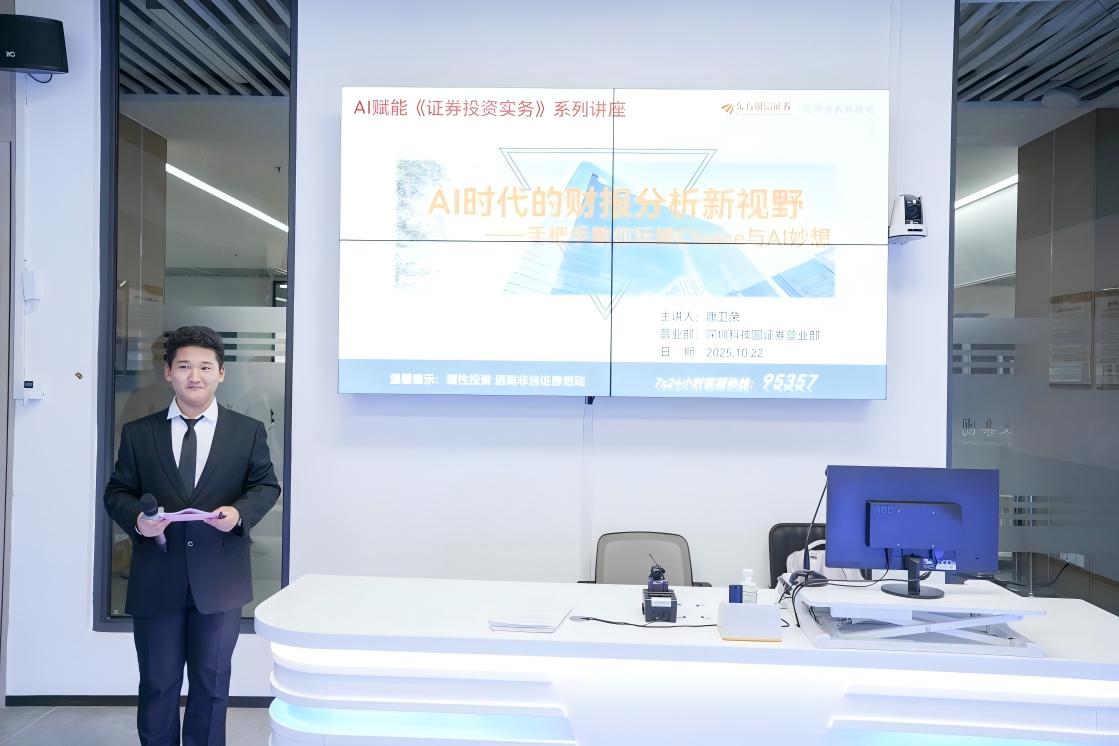 2025年10月22日,金融协会成功举办"AI赋能《证券投资实务》系列讲座——AI赋能财务报表分析"专题讲座,特邀东方财富证券深圳科技园营业部总经理康卫荣担任主讲。康总通过生动的实战案例演示,系统展示了Choice金融终端与妙想AI工具在企业投资价值分析中的创新应用。现场,他从基础数据查询到深度财务分析的全流程操作演示,重点解析了如何快速提取企业财务数据,并利用先进的七维度风险评估体系精准识别企业潜在风险,让在场师生深刻感受到智能工具如何重塑传统的财报分析模式。