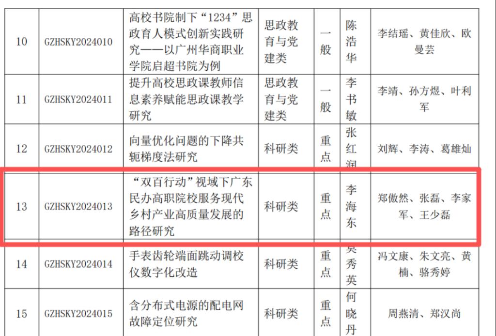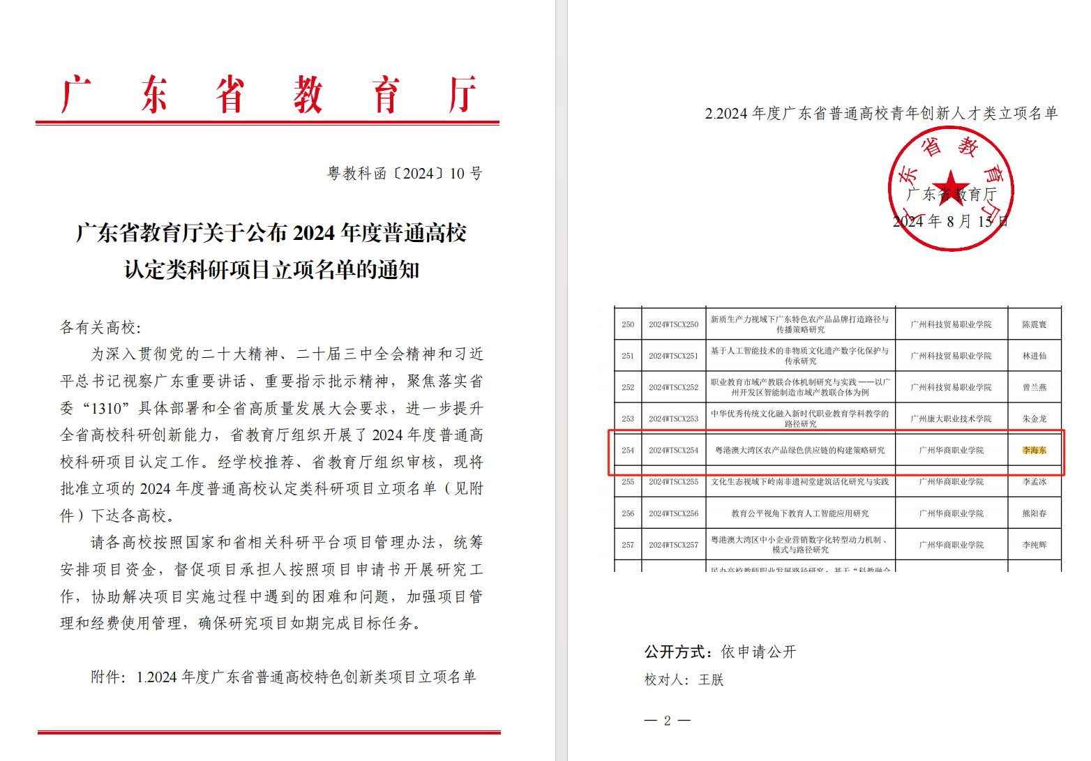 科研创新聚焦痛点:主持3 项在研课题 —— 中国物流学会面上课题 “粤港澳大湾区农产品绿色供应链的构建策略研究”(2024CSLKT3-220)、广东省普通高校特色创新类项目 “粤港澳大湾区农产品绿色供应链的构建策略研究”(2024WTSCX254)、校级重点科研项目 “‘双百行动’视域下广东民办高职院校服务现代乡村产业高质量发展的路径研究”(GZHSKY2024013),以科研成果破解产业与教育衔接的难点问题。