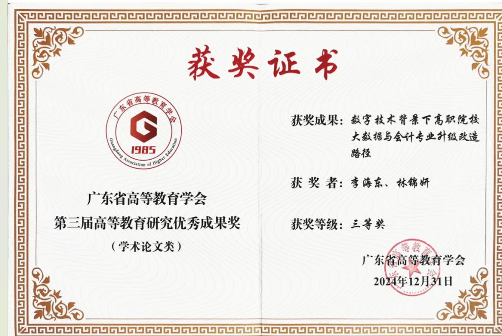 从教以来,他先后荣获“2024 年优秀党员”“2023 年度优秀教师”“2023 年度优秀党员”“2023 年秋季学期优秀班主任” 等荣誉,2024 年 12 月凭借论文《数字技术背景下高职院校大数据与会计专业升级改造路径》获广东省高等教育学会第三届高等教育研究优秀成果奖(学术论文类)三等奖,是集 “教学、科研、育人、服务” 于一体的复合型职教教师。