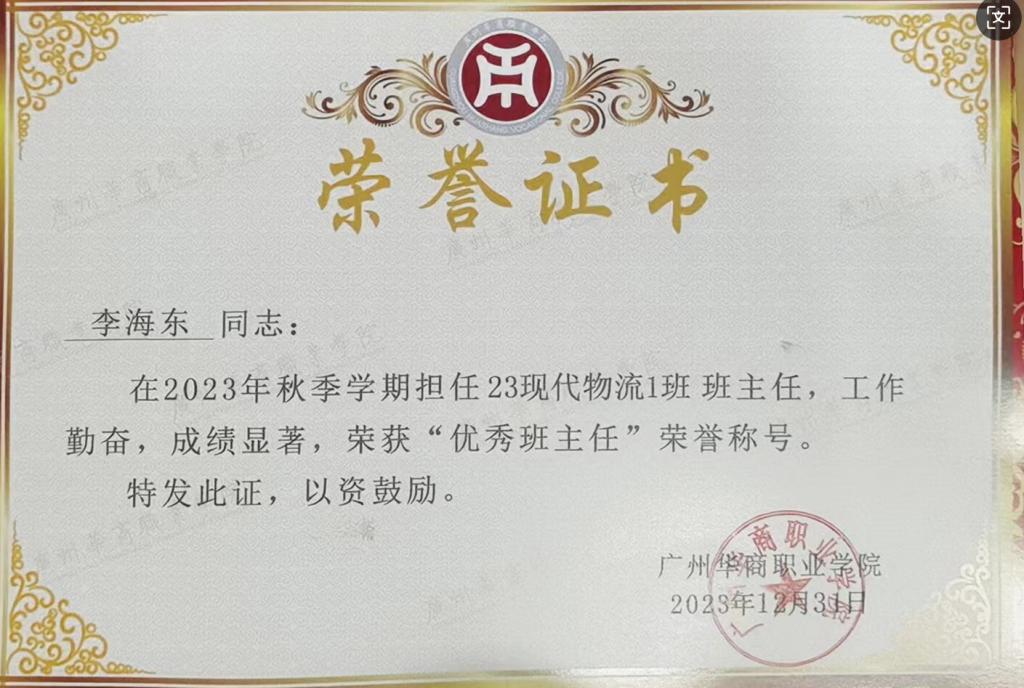 作为23 级现代物流管理专业 1 班(52 人,男生 36 人、女生 17 人)班主任,李海东始终将 “立德树人” 放在首位。他坚持 “日常关怀 + 思想引导” 双轨并行:及时转发反诈海报设计比赛、专插本报考指南等信息,为学生搭建成长平台;召开 “抓班风 促学风”“诚实做人 诚信考试” 主题班会,强化班级凝聚力与学习自觉;定期走访学生宿舍,细致了解学生大学适应情况与课余安排,及时化解生活困惑;课前主动宣讲 “禁玩手机、禁带早餐、禁楼道吸烟” 等纪律,引导学生践行新时代大学生准则,所带班级学风浓厚,他本人也因此获评 “2023 年秋季学期优秀班主任”。