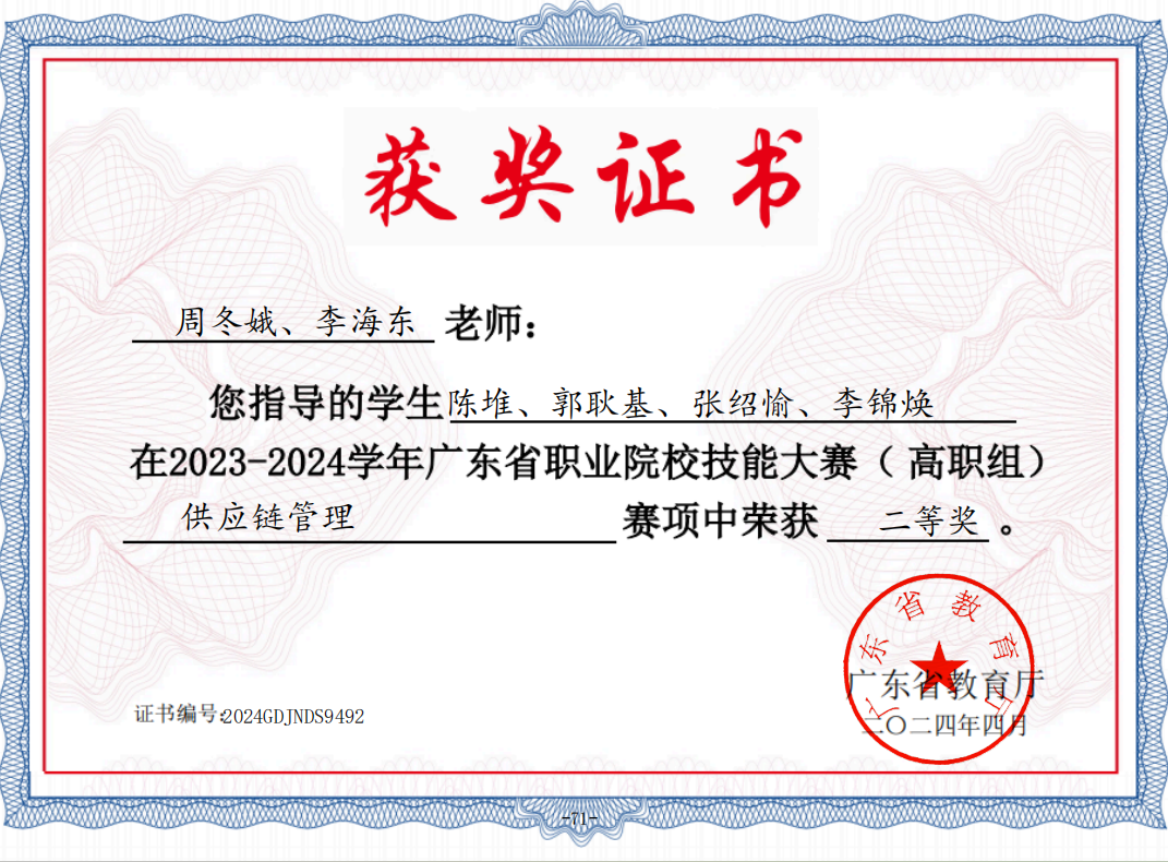 2024 年 4 月,指导学生陈堆、郭耿基等参加广东省 2023-2024 高职院校技能大赛 “供应链管理” 赛项,从方案设计到模拟实操全程陪伴,最终斩获省级二等奖(排名 2);