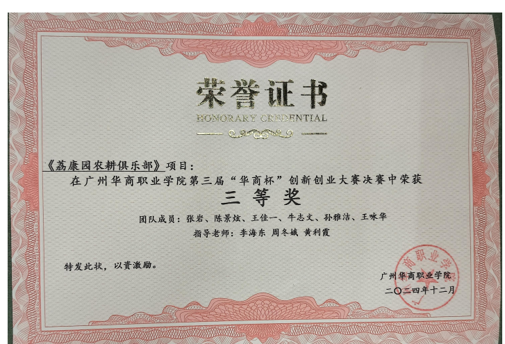 2024 年 11 月,指导《荔康园农耕俱乐部》项目团队参加第三届 “华商杯” 创新创业大赛,结合乡村振兴与农耕文化创新项目思路,帮助团队获校级三等奖(排名 1);