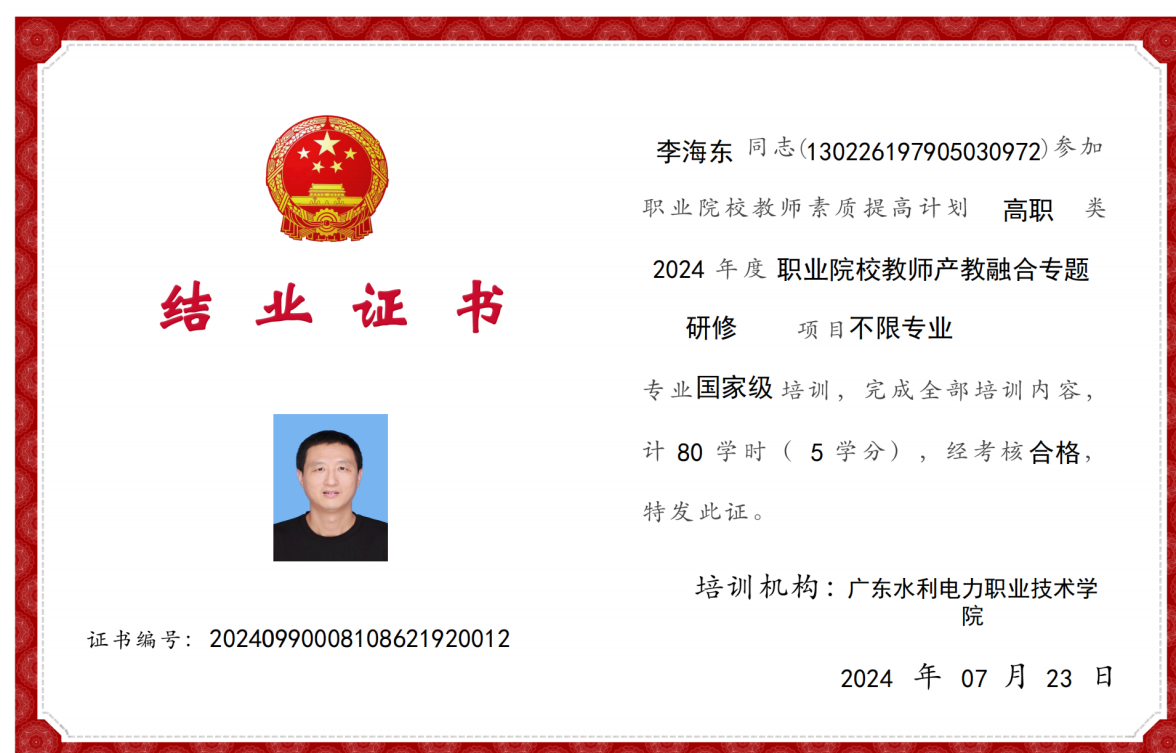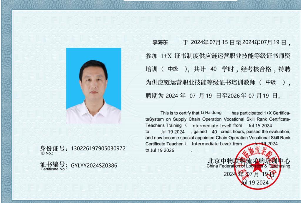 能力提升持续不辍:2024 年 7 月先后参加 “职业院校教师产教融合专题培训”(80 学时,广东水利电力职业技术学院)、“1+X 证书制度供应链运营职业技能等级证书师资培训(中级)”(40 学时,北京中物联物流采购培训中心),获供应链运营职业技能等级证书培训教师(中级)资格,持续更新教育理念与专业技能。
