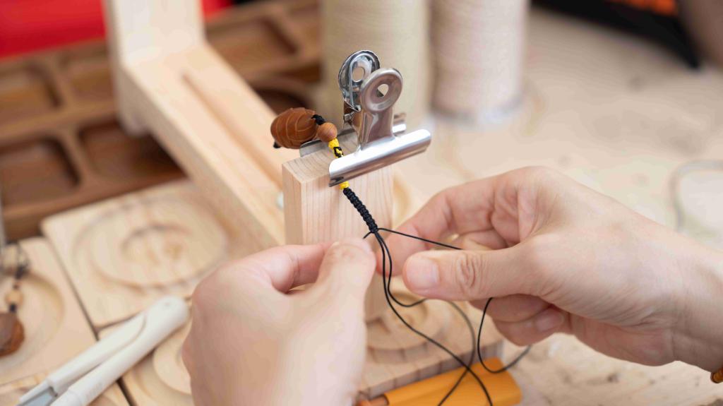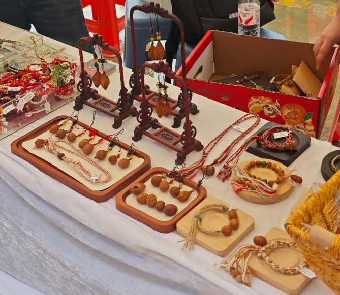 作为国家级非物质文化遗产,增城榄雕在"榄君手作"的木质展架上焕发新生。团队将传统技艺与现代审美融合,展出"岭南荔枝"项链、"新生竹芽"手绳等20余件榄雕精品,搭配绳结及石珠手串,让静态展品与动态体验交织。学院苏冠南老师现场演示乌榄微雕技艺、黄飞凤老师展示手绳编织、林君师兄带客户进行现场DIY串手串。师生团队则带领学生穿珠引线,将手作课堂搬进市集。从雕刻橄榄核到编织彩线,百余名学子亲手创作专属手作,体验区里此起彼伏的惊叹声与欢笑声,成为非遗活态传承的生动注脚。