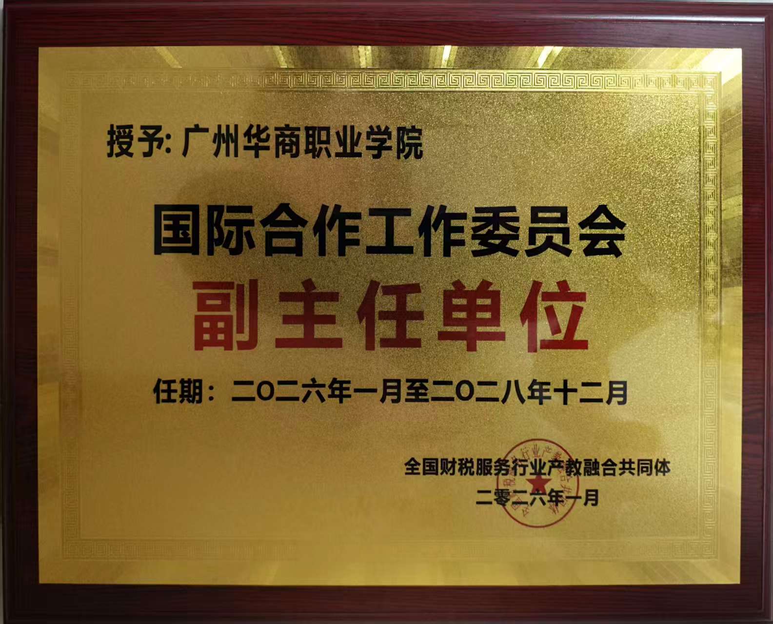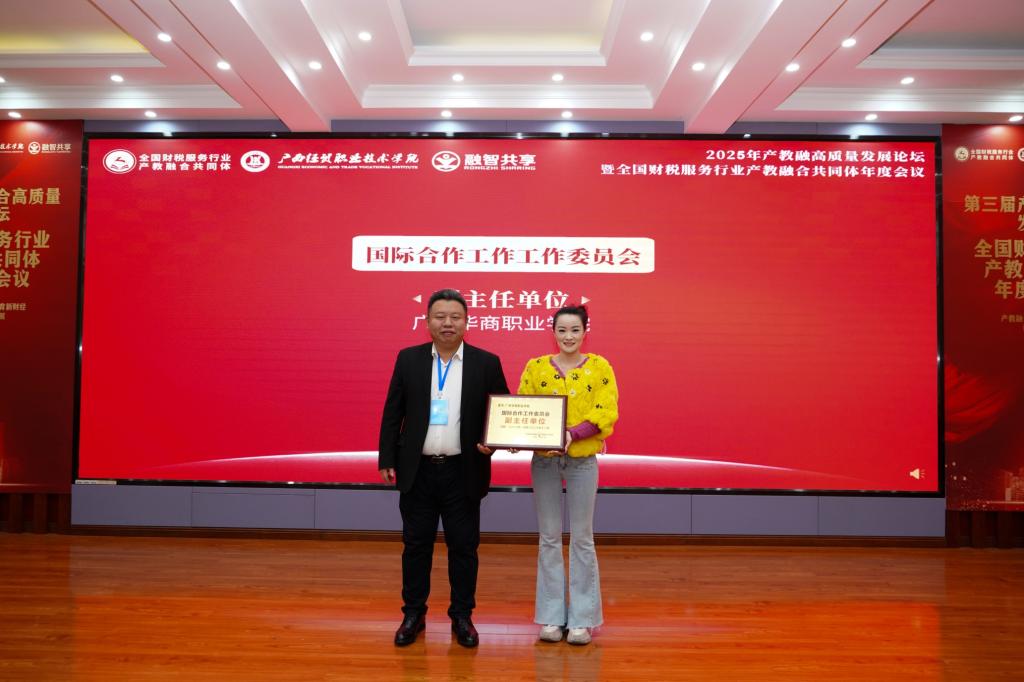 本次会议同步举行了全国财税服务行业产教融合共同体各专项工作委员会主任单位和副主任单位授牌仪式。凭借在国际合作领域的积极探索与突出成果,广州华商职业学院成功当选国际合作工作委员会副主任单位,潘虹副院长代表学院接受授牌。这一荣誉既是对学院产教融合、国际交流合作工作的高度肯定,也为学院进一步整合优质资源、拓展国际合作空间、深化财税领域人才培养国际化奠定了坚实基础。