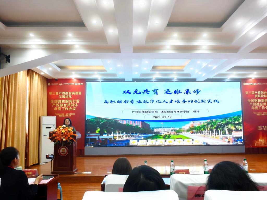 会议期间,杨玲院长以《双元共育运维兼修:高职财会专业数字化人才培养的创新实践》为题作主题报告。报告立足高职财会专业人才培养痛点,结合广州华商职业学院低空经济与商务学院在产教融合、校企协同育人方面的实践经验,深入阐述了“双元共育”模式的构建逻辑、“运维兼修”的培养特色,详细分享了学院在课程体系数字化重构、实训基地共建、师资队伍双师化建设等方面的创新举措与显著成效,为高职财会专业数字化转型提供了可借鉴的实践样本,赢得了现场参会嘉宾的广泛认可与热烈反响。