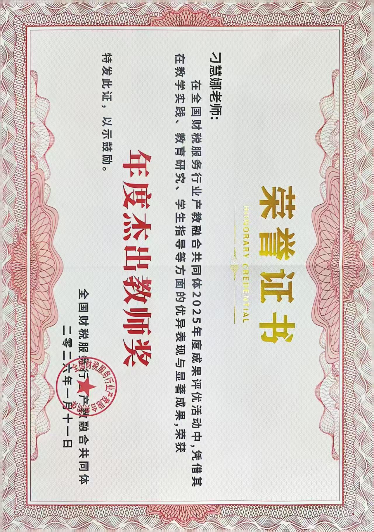 在会议表彰环节,刁慧娜老师凭借在财税教学一线的深耕细作、在产教融合实践中的积极探索以及显著的教学成效,荣获“全国财税服务行业产教融合共同体年度杰出教师”称号。这一荣誉不仅是对刁慧娜老师个人教学能力与职业素养的认可,更是学院重视师资队伍建设、鼓励教师投身教育教学创新的生动体现。