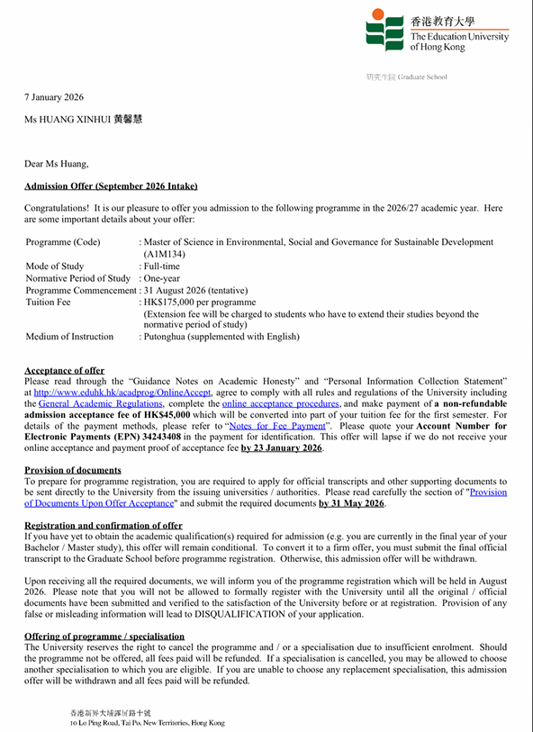 “陈老师,我想与您分享一个好消息,我收到香港教育大学硕士研究生的录取通知书了!”2026年1月30日,一则喜讯传来——黄馨慧成功斩获香港教育大学环境、社会、管治与可持续发展理学硕士(ESGSD)研究生录取通知书!从广州华商职业学院到广州商学院,再到香港教育大学,她用五年时间完成了从专科生到硕士研究生的华丽蜕变,每一步都走得坚定而有力,每一次跃升都离不开过往岁月里的日积月累与不懈坚持。这份耀眼的成绩,不仅是对她个人努力的最好回报,更是广州华商职业学院“厚德、励志、博学、创新”校训精神的生动体现,是学校优质教育资源与先进育人理念的有力见证。