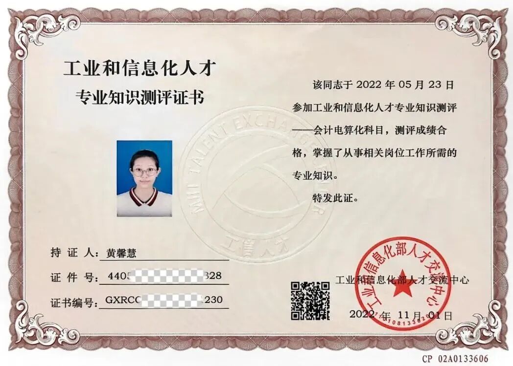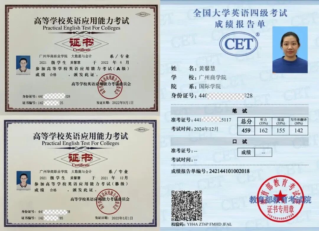 除了竞赛与学业上的亮眼成就,黄馨慧还积极考取各类资格证书,为自己的未来发展增添硬核筹码。在校期间,她凭借不懈努力顺利通过高等学校英语应用能力考试A、B级,成功拿下全国高等学校计算机水平考试一级证书,先后考取职业技能培训证书——财务管理师(初级)、工业和信息化人才专业知识测评证书——会计电算化科目,更以459分的优异成绩顺利通过全国大学英语四级考试。一张张含金量十足的证书背后,是她利用课余时间的刻苦钻研,是她对自我要求的不断提升,更是她为未来职业发展与学业进阶铺设的坚实道路。