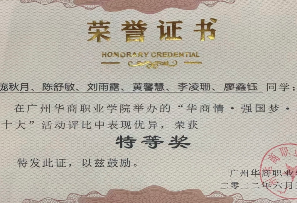 这份勇于挑战、勤于耕耘的精神,让黄馨慧收获了诸多沉甸甸的荣誉。在专业领域,她凭借扎实稳固的会计功底与出色娴熟的实操能力,代表广州华商职业学院征战广东省学生专业技能竞赛,在众多参赛选手的激烈角逐中脱颖而出,最终斩获三等奖的优异成绩,为校争光;在校园学习生活中,她连续斩获学校优秀学生二等奖、三等奖学金,拿下学院全勤奖、学习标兵等多项荣誉称号,用实打实的成绩印证了“一分耕耘,一分收获”的真理;在思想引领类活动中,她与团队成员凝心聚力、反复打磨作品,在“华商情·强国梦·喜迎二十大”活动评比中崭露头角,成功荣获“特等奖”,充分展现了华商新时代青年学子深厚的家国情怀与强烈的责任担当。