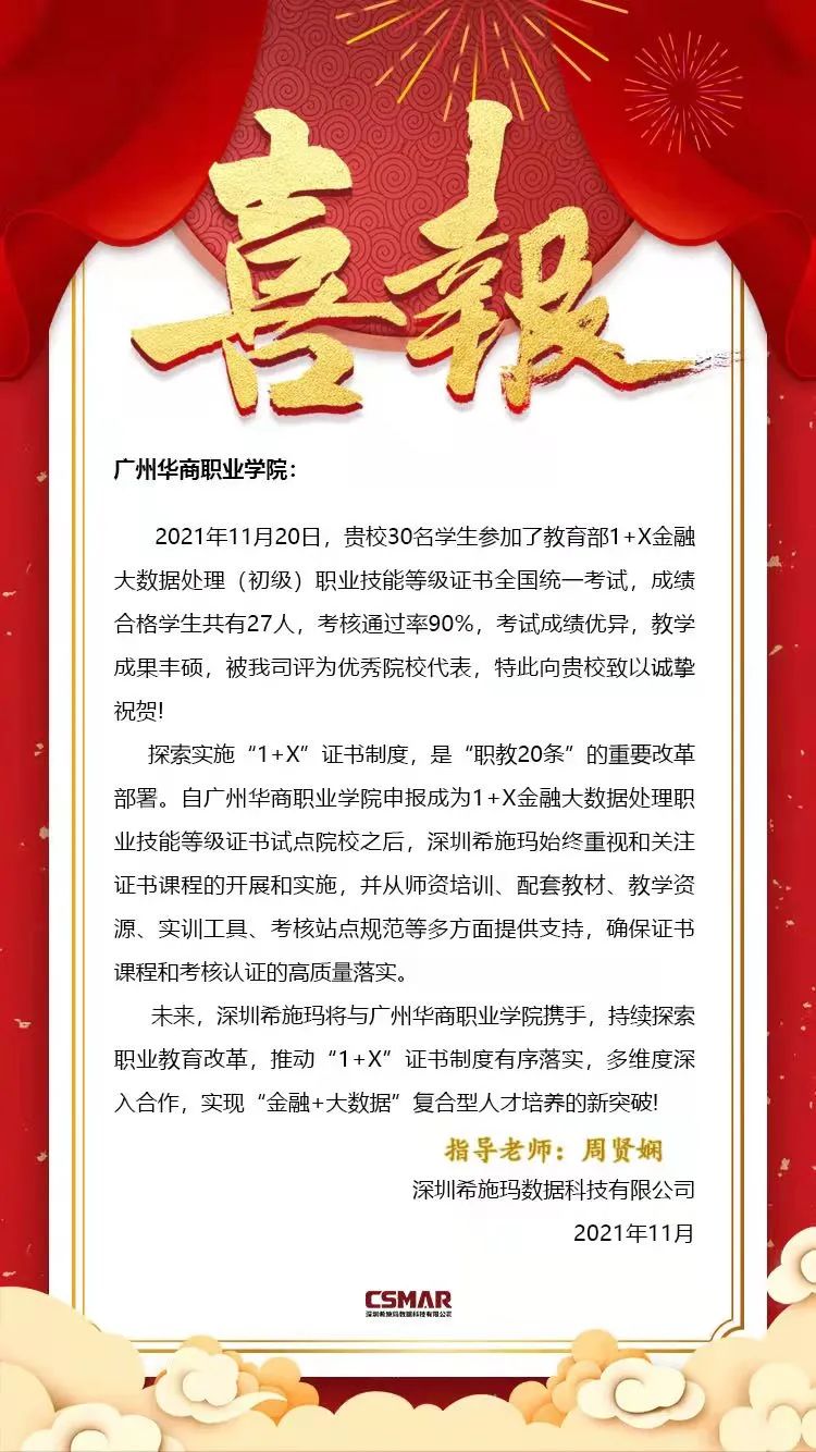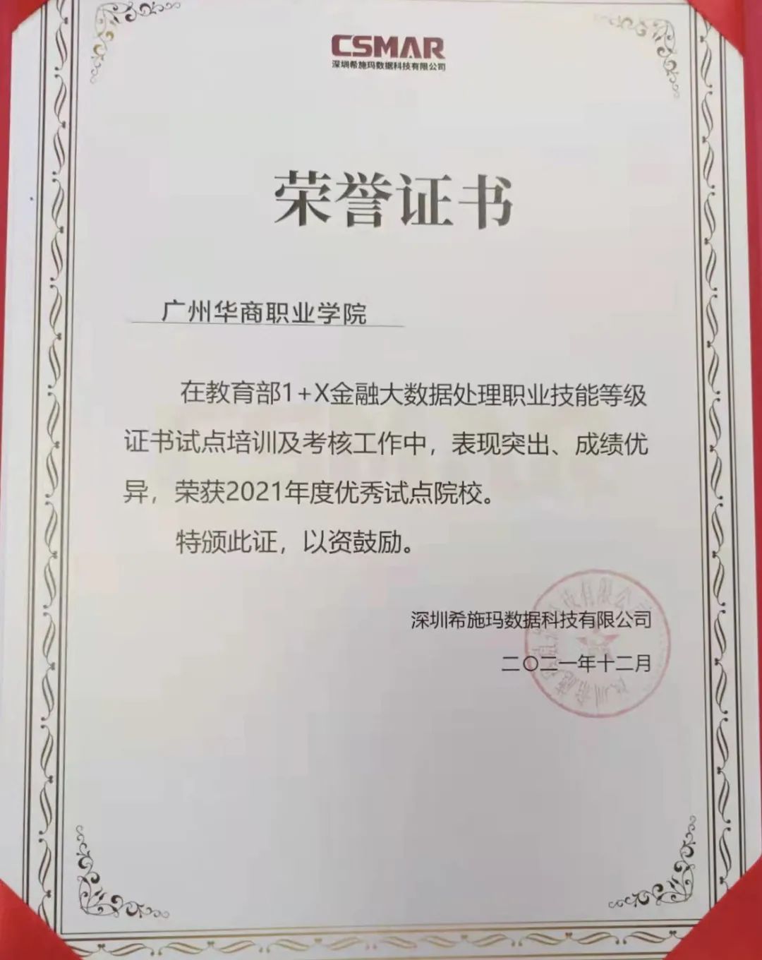 2021年,广州华商职业学院在教育部1+X金融大数据处理职业技能等级证书试点培训及考核中,表现突出、成绩优异,荣获2021年度优秀试点院校。