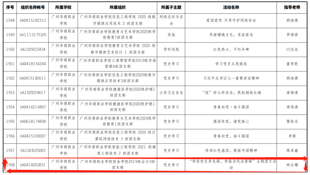 为深入学习习近平新时代中国特色社会主义思想,推进党史学习教育走深走实,引领广大团员青年“传承红色基因,赓续精神血脉”坚定不移听党话、矢志不渝跟党走,增强基层团组织的凝聚力,加强基层团组织建设团员自我教育,积极响应团省委号召,秋季学期校团委发动基层团组织积极开展“活力在基层”主题团日竞赛活动,经学校推荐和团省委遴选,我院2019级会计3班团支部“学好党史争先锋,学做当代活雷锋”主题团日活动荣获2021年广东省高校“活力在基层”主题团日活动竞赛秋季赛季“千入围”项目,指导老师林汶樱。