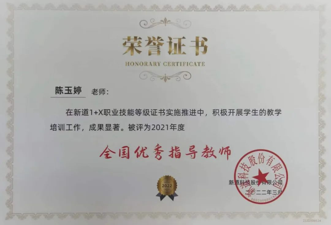 这些成果离不开学校领导,财金学院党政联席班子的指导与支持,也离不开考证培训老师的悉心指导,陈玉婷老师积极开展学生的培训工作,被评为2021年度“全国优秀指导教师”。
