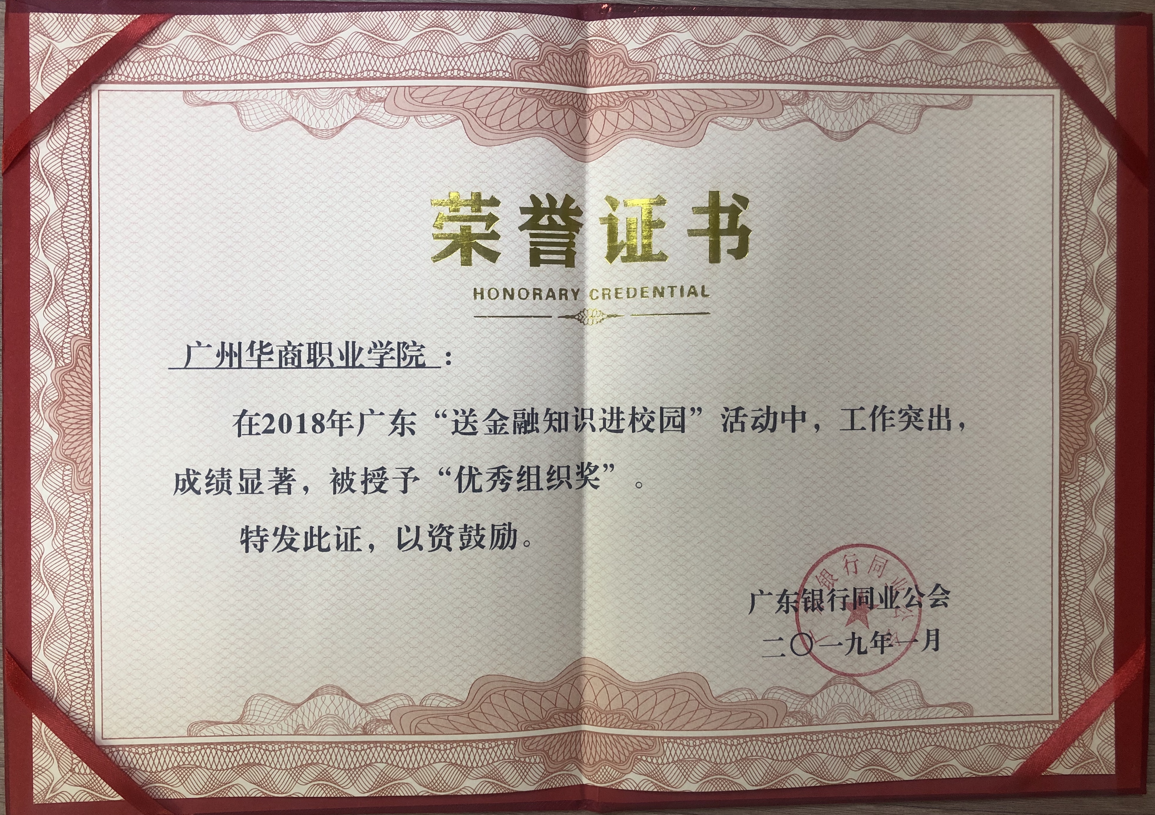 在由中国银行业监督管理委员会广东银监局、共青团广东省委员会、广东省教育厅主办的2018年“金彩杯”广东大学生金融知识挑战赛中,我院积极组织学生参与比赛,认真贯彻落实送金融知识进校园活动,工作突出、组织到位、教育效果良好,在2018年广东“送金融知识进校园”活动中,荣获“优秀组织奖”。