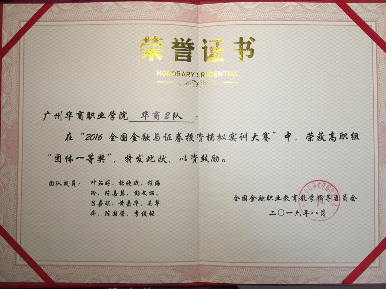 “2016全国金融与证券投资模拟实训大赛”荣获高职组“团体一等奖”