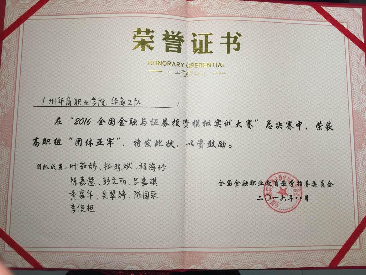 “2016全国金融与证券投资模拟实训大赛”总决赛荣获高职组“团体亚军”