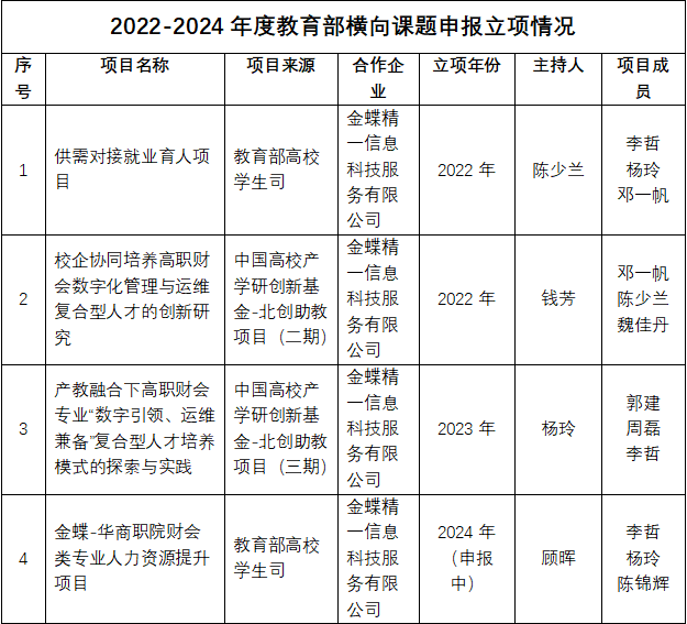 十四五期间,财金学院高度重视科研课题申报与立项,并结合校企合作和学生工作,认真落实“产教融合”,大力开展高质量科研建设,有效对接我国重大战略需求和地方经济社会发展,为培养财经技术技能型人才整体赋能。2022-2024年度,共主持或参与教育部横向课题四项。